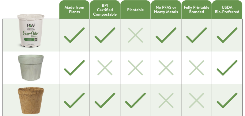 The Proven Winners® Eco+ Grande® and Eco+ Elite™ Containers are an industrial compostable (ASTM D6400) garden pot, made out of all-natural ingredients that form PLA (polylactic acid). PLA is made from sugars derived from corn and sugar beet plant parts (not what is eaten) grown right here in the U.S. Starch from these sugars is processed into a biopolymer that looks, acts and performs like traditional plastic, but is much better for the environment.