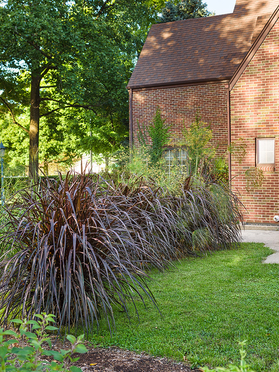 In this mixed border filled with native cultivars of colorful perennials and shrubs, we selected a native switch grass to add height, texture and movement to the grouping. Without the addition of this grass, the planting would look “flat”, with most plants being of the same size and texture. Ornamental grasses in garden can be pivotal in the design of a garden bed.
