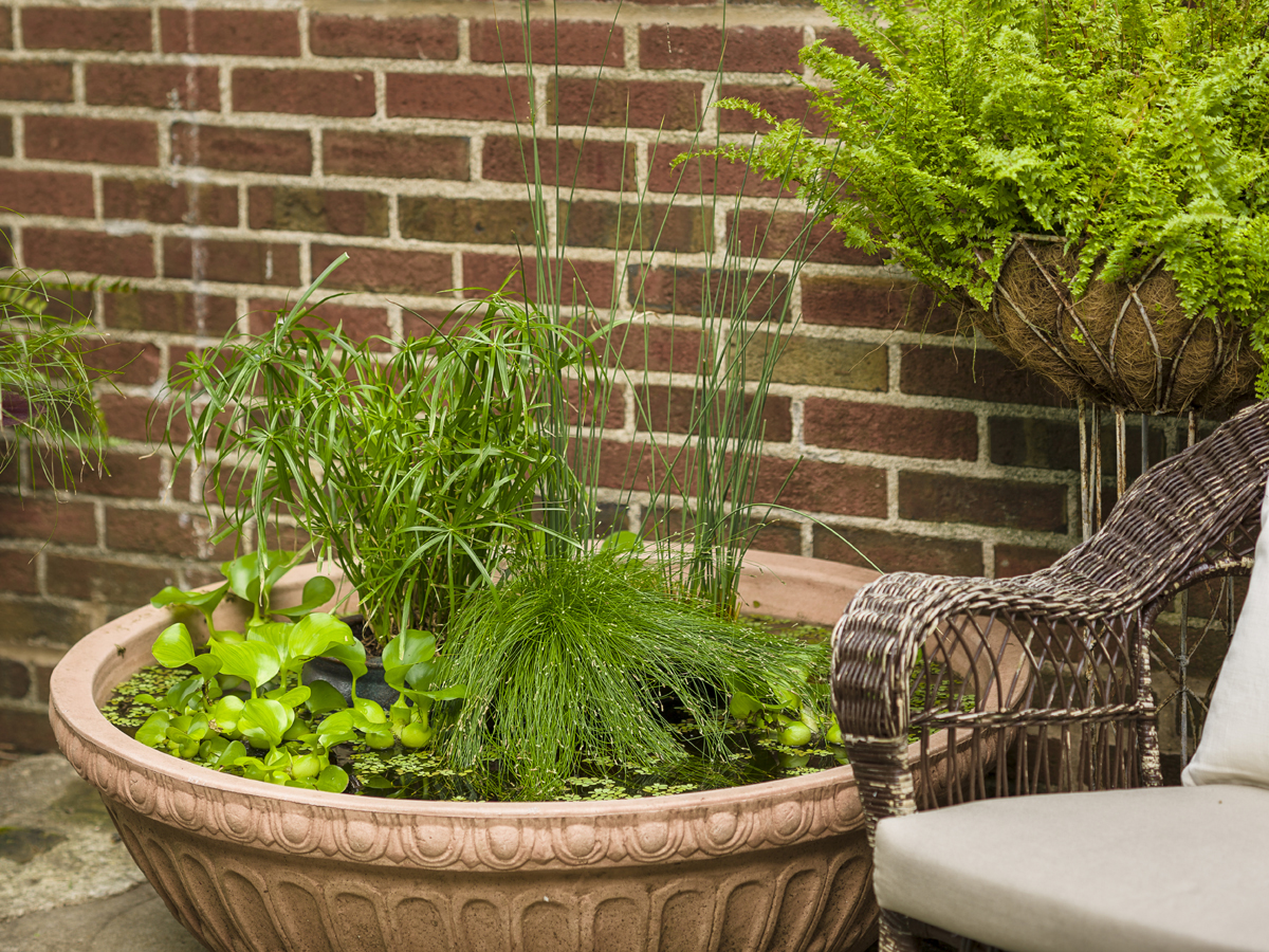 Select types of ornamental grasses you may have used in your container recipes are also suitable for growing in water. This patio-sized water garden contains Graceful Grasses® Baby Tut®, fiber optic grass and Blue Mohawk® soft rush.