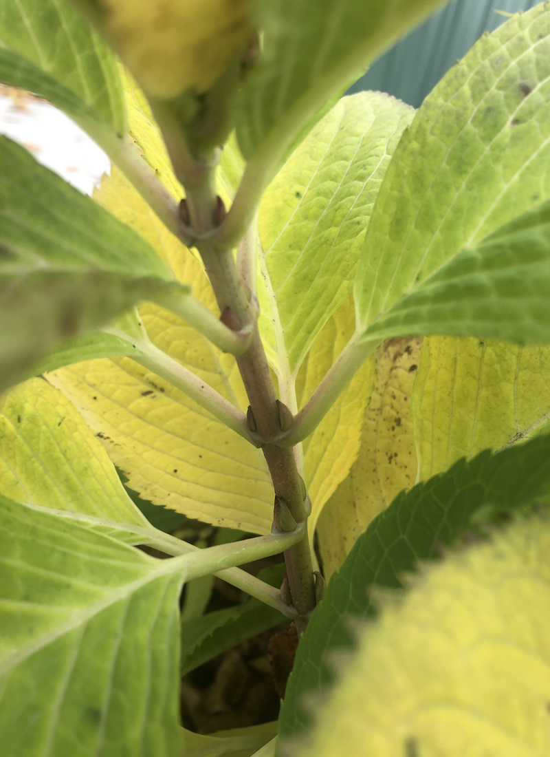 Bigleaf hydrangeas bloom on old wood, which means they set their flower buds for next summer in the leaf axils of the stems the year before they bloom. In the picture above taken in October, you can see the reddish buds in the axils up the stem.