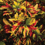 Wild twists and twirls of red, yellow, green and purple splash the foliage of this sun-loving coleus